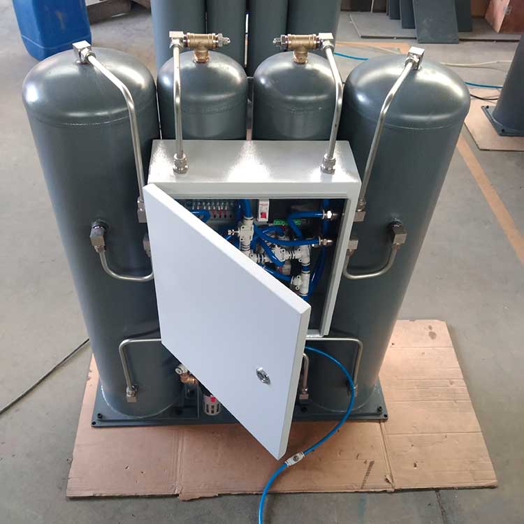 制氮機是一種以空氣為原料,通過物理方法分離氧和氮而獲得氮氣的設備。根據分類方法的不同,工業上應用的制氮機可以分為深冷空分法、分子篩空分法(PSA)和膜空分法三種。制氮機是按照變壓吸附技術設計和制造的氮氣制取設備,以優質進口碳分子篩(CMS)為吸附劑,采用常溫下變壓吸附原理(PSA)分離空氣制取高純度氮氣。通常使用兩個吸附塔并聯,由進口 PLC 控制進口氣動閥自動運行,交替進行加壓吸附和解壓再生,完成氮氧分離,獲得所需高純度的氮氣。